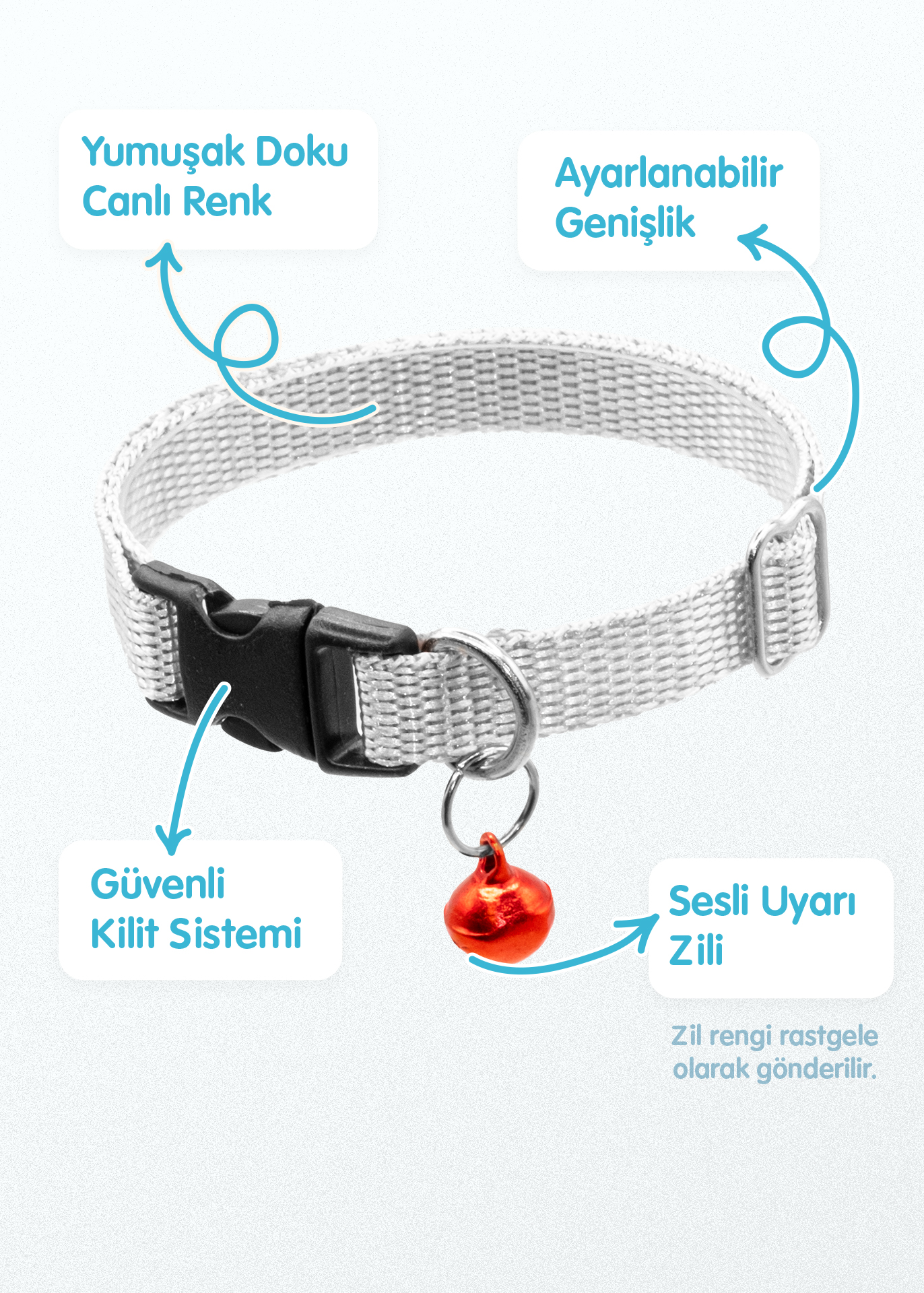 18–32 cm arası ayarlanabilir yapısı sayesinde tüm kedi türlerine uyum sağlar. Sesli uyarı zili ile hem rahat hem kontrollü kullanım sunar. İp kalınlığı 1 cm’dir. Hayvan sağlığına zararsız, yüksek kaliteli malzemelerden Türkiye’de üretilmiştir.