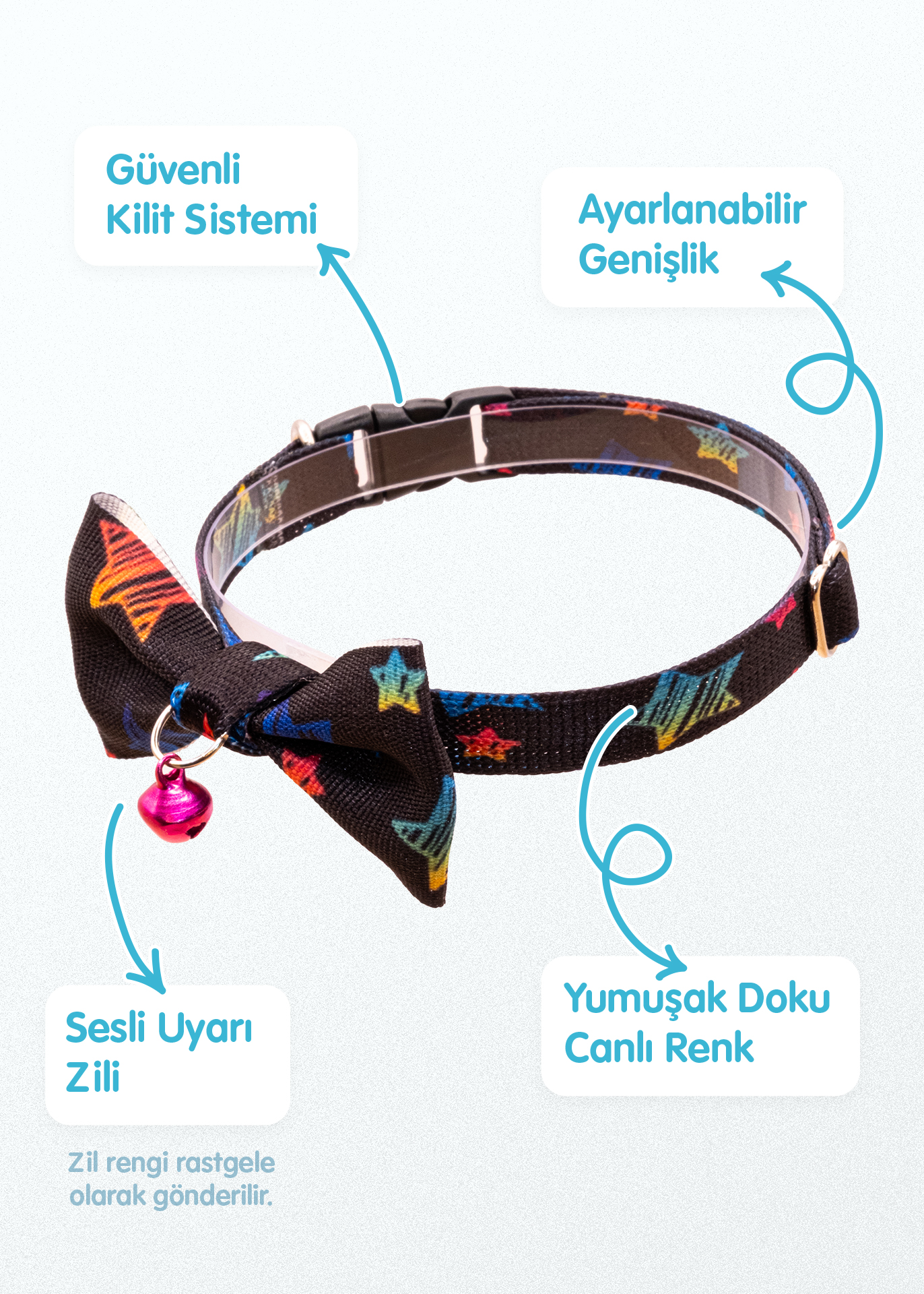 18–32 cm arası ayarlanabilir yapısı sayesinde tüm kedi türlerine uyum sağlar. Sesli uyarı zili ile hem rahat hem kontrollü kullanım sunar. İp kalınlığı 1 cm’dir. Hayvan sağlığına zararsız, yüksek kaliteli malzemelerden Türkiye’de üretilmiştir.